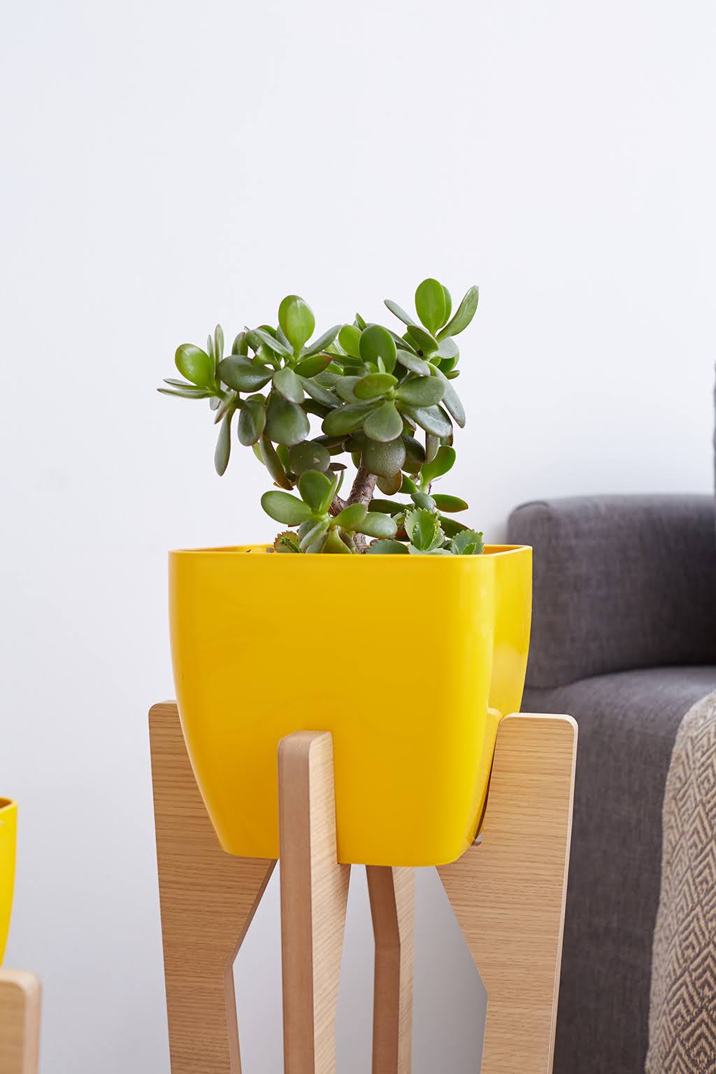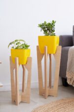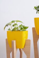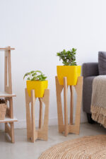 Material. Melamina roble de 18 mm de espesor + maceta plásticas color amarillo.