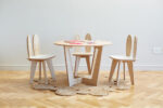Combo ROMA conejo mixto – Mesa roma 70 roble + banquitos conejo blancos